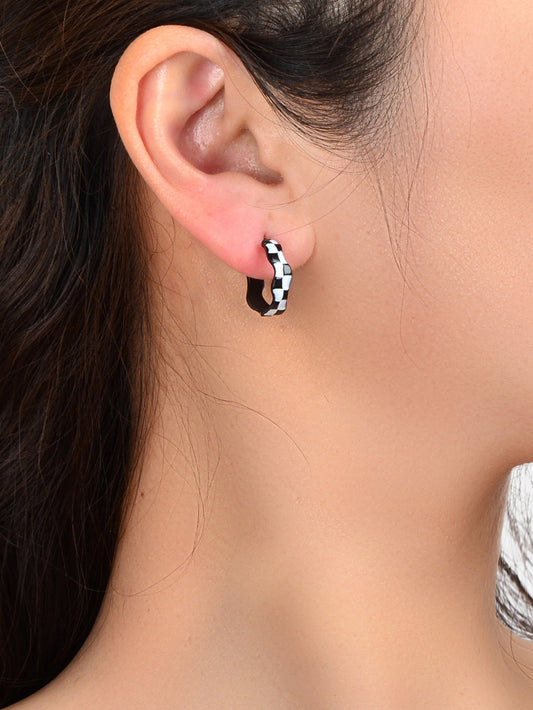 Unique 90s Vintage C Shaped Grid Black White Checkerboard Huggie Hoop Earrings